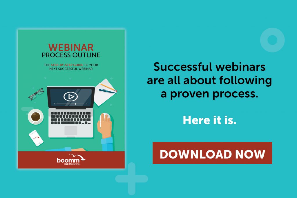 Boomm B2B Marketing developed a webinar process outline to help our clients make the best impression in this critical channel. The outline worked so well that we want to share it with you. Simply download the Webinar Process Outline Guide.
