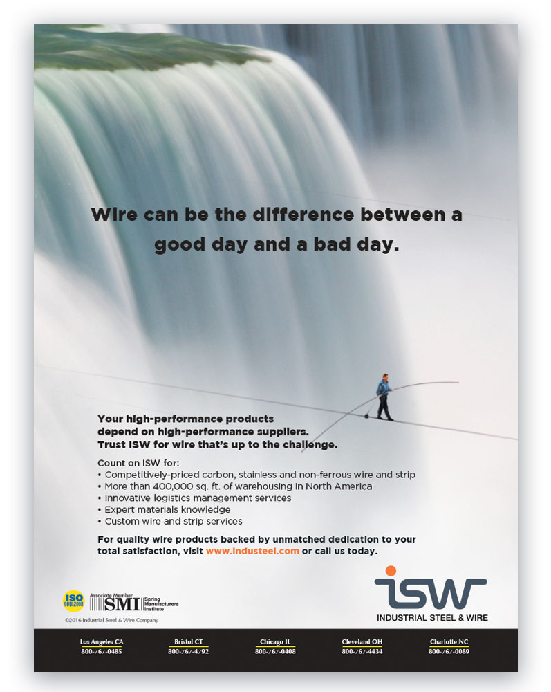 The campaign: Boomm created an ad featuring a tightrope walker balanced precariously over Niagara Falls. The message? Wire can be the difference between a good day and a bad day—and Industrial Steel and Wire should be your trusted supplier. We also created a striking booth for use at trade shows, providing a way for ISW to stand out and reach new customers.
